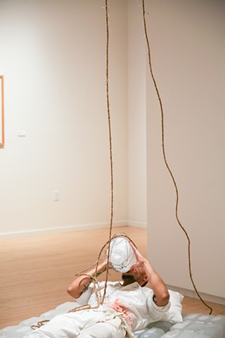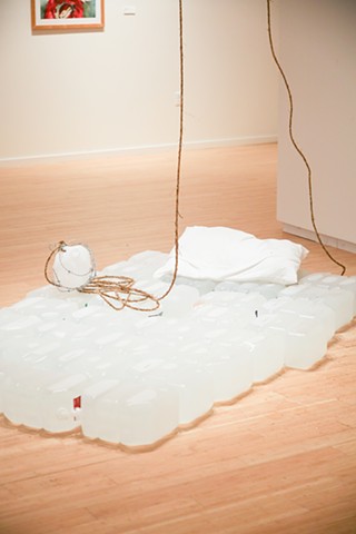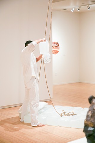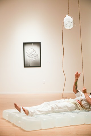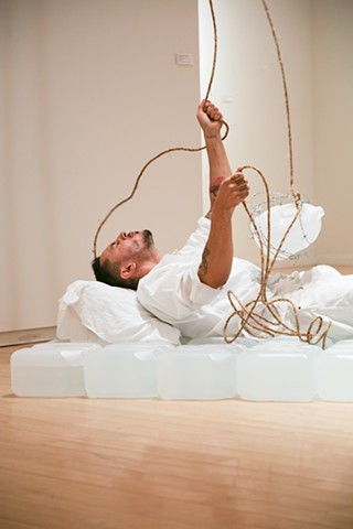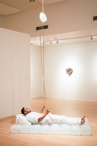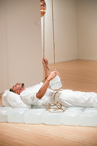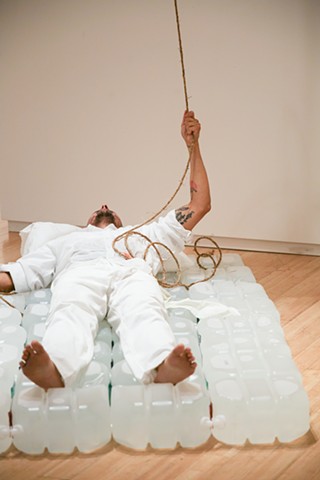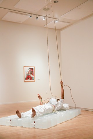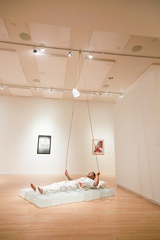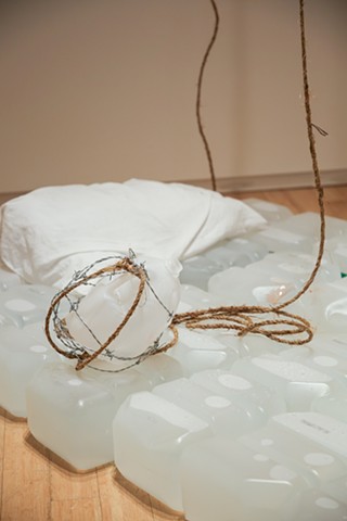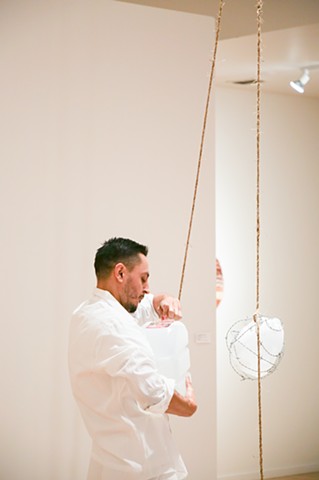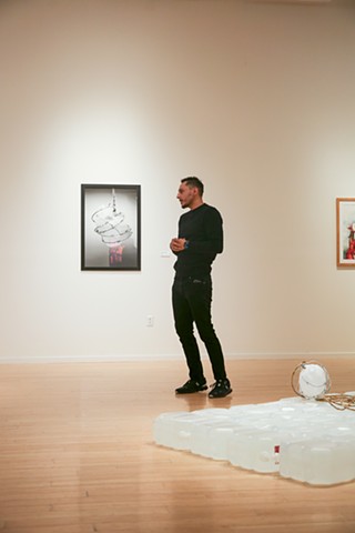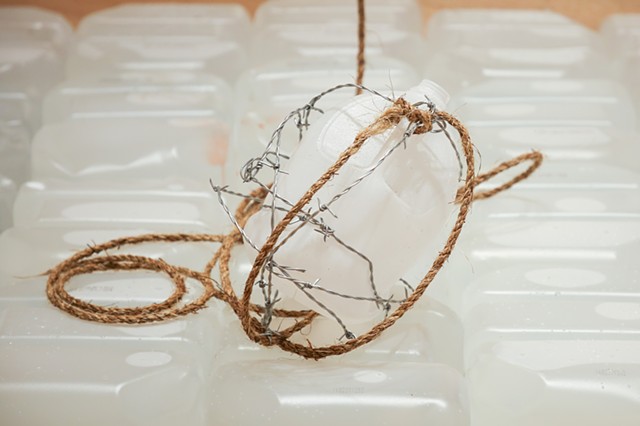Water, a wellspring of existence, exhibits a dual nature- simultaneously serving as a life-giving force and being wielded as a tool of aggression when transformed into a barrier for migrants navigating the “border.” This work establishes a profound link to the ancestral journey of Villalobos’ family across this boundary, a voyage undertaken outside legal confines prominently embodied by his mother. The narratives she shared regarding the arduous passages through bodies of water and arid terrains encapsulate an intricate tapestry of heritage, shaping the very essence of the artist’s identity.